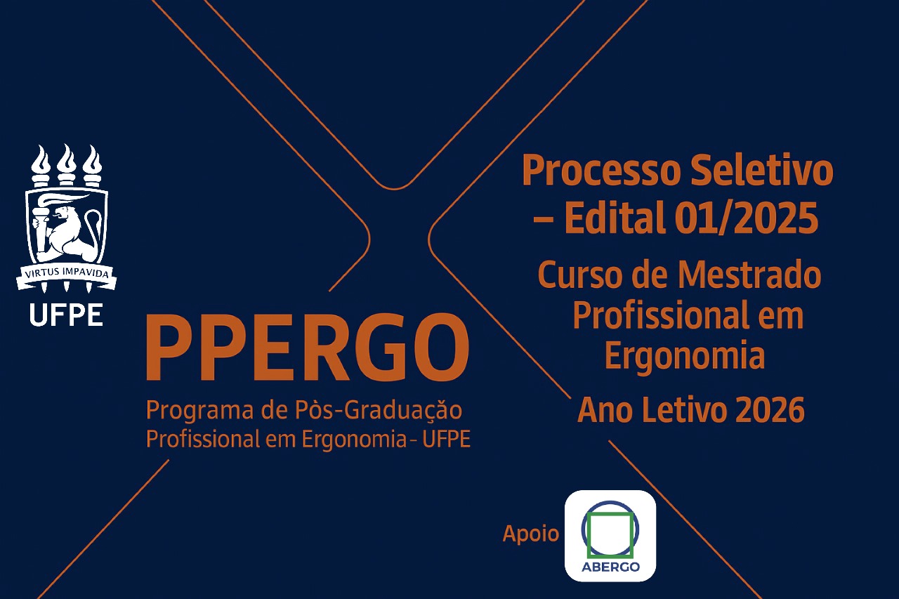 O Programa de Pós-Graduação Profissional em Ergonomia (PPERGO/UFPE) informa à comunidade acadêmica e ao público interessado que foi publicado o Edital de Seleção nº 01/2025, referente ao processo seletivo para admissão de novos(as) discentes ao Curso de Mestrado Profissional em Ergonomia, com ingresso no ano letivo de 2026.
